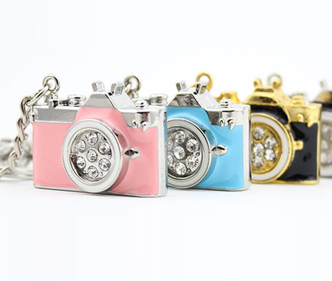 這款相機珠寶U盤,外形精致逼真,金屬部分采用鋅合金電鍍工藝制作,光滑平整,正面粉紅、藍色色等部位則是滴油工藝制成,加上水晶鉆石作為點綴,時尚可愛,精美絕倫!